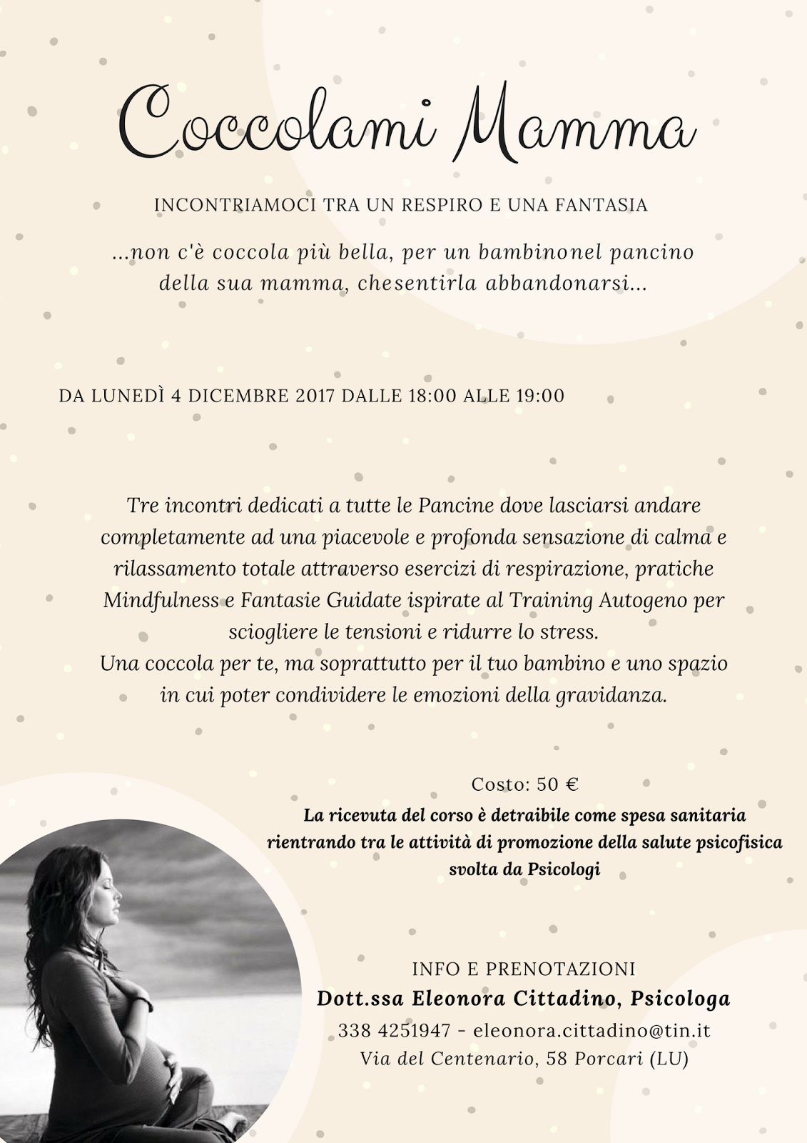 Tre incontri (a cadenza settimanale) dedicati a tutte le Pancine dove lasciarsi andare completamente ad una piacevole e profonda sensazione di calma e rilassamento totale attraverso esercizi di respirazione, pratiche Mindfulness e Fantasie Guidate ispirate al Training Autogeno per sciogliere le tensioni e ridurre lo stress.